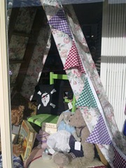 At the Old Pill Factory today, Fiona had started to do a “children on holiday” themed window, with an A-frame ladder draped in (my) rosey fabric, to make an impromptu tent filled with teddies, wooden games, tiny teaset and other bits ‘n’ pieces.